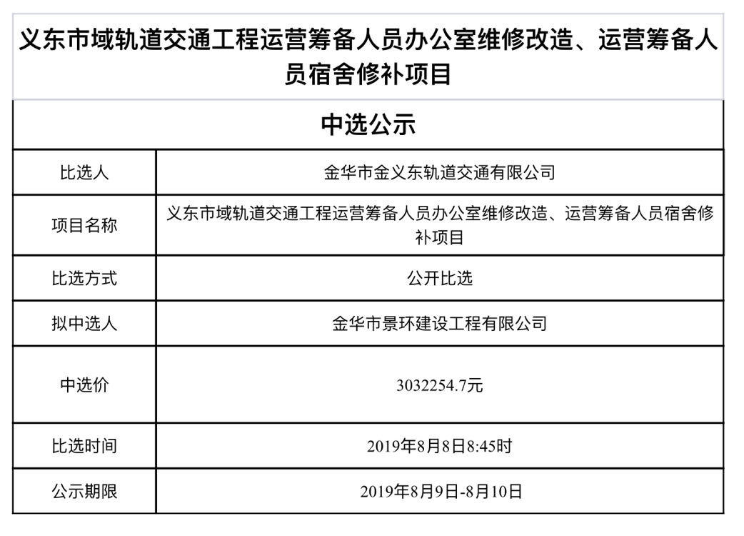 金華市金義東軌道交通有限公司運營2026-2027年大型設(shè)備及系統(tǒng)框架維修項目中標候選人公示
